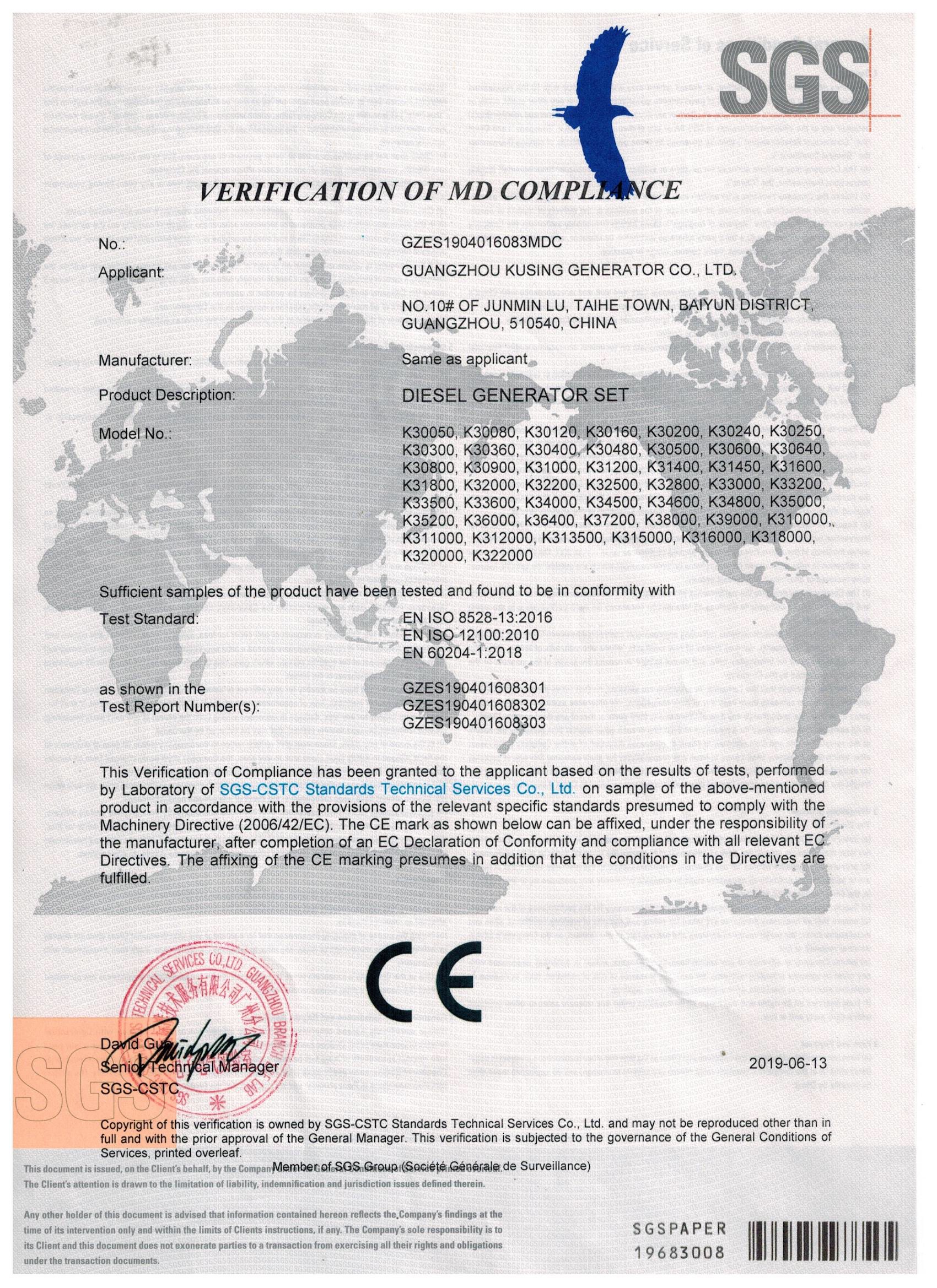 说明:本合规性验证是根据有限公司通标标准技术服务有限公司实验室根据相关具体标准的规定对上述产品样品进行的试验结果授予申请人的,该具体标准被认为符合机械指令(2006/42/EC)。在完成EC符合性声明并符合所有相关EC指令后,制造商可负责贴上如下所示的CE标志。CE标志的附加还假定指令中的条件得到满足。