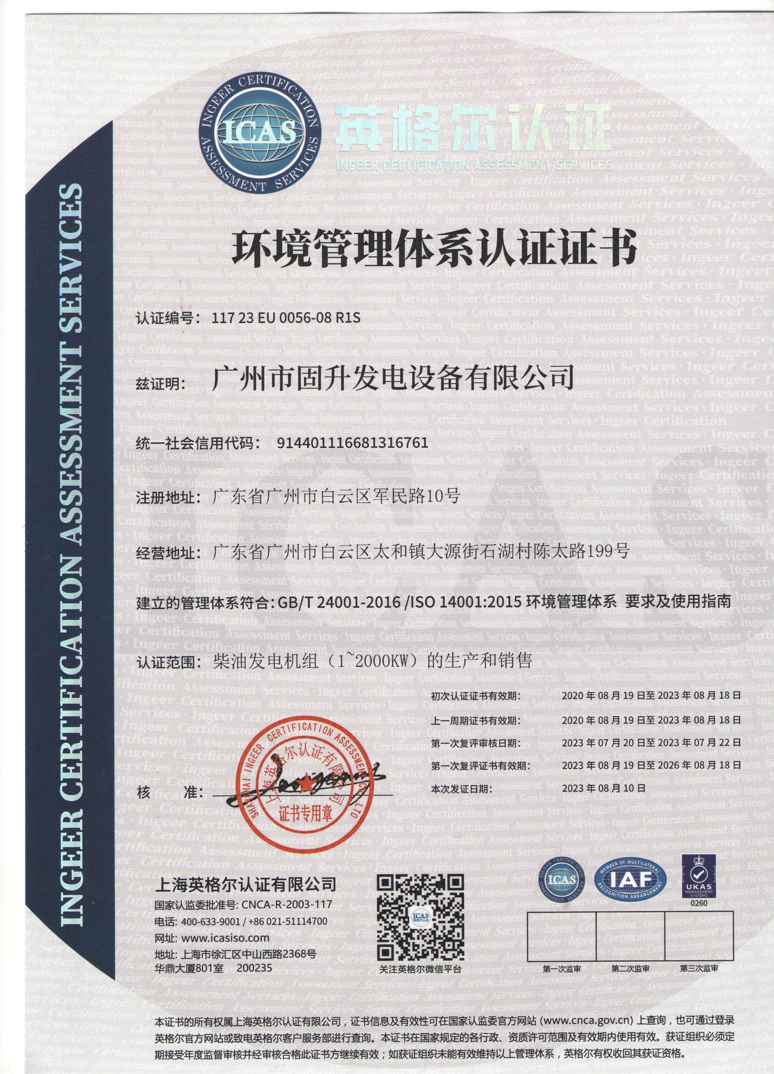 证书类型:ISO14001证书
