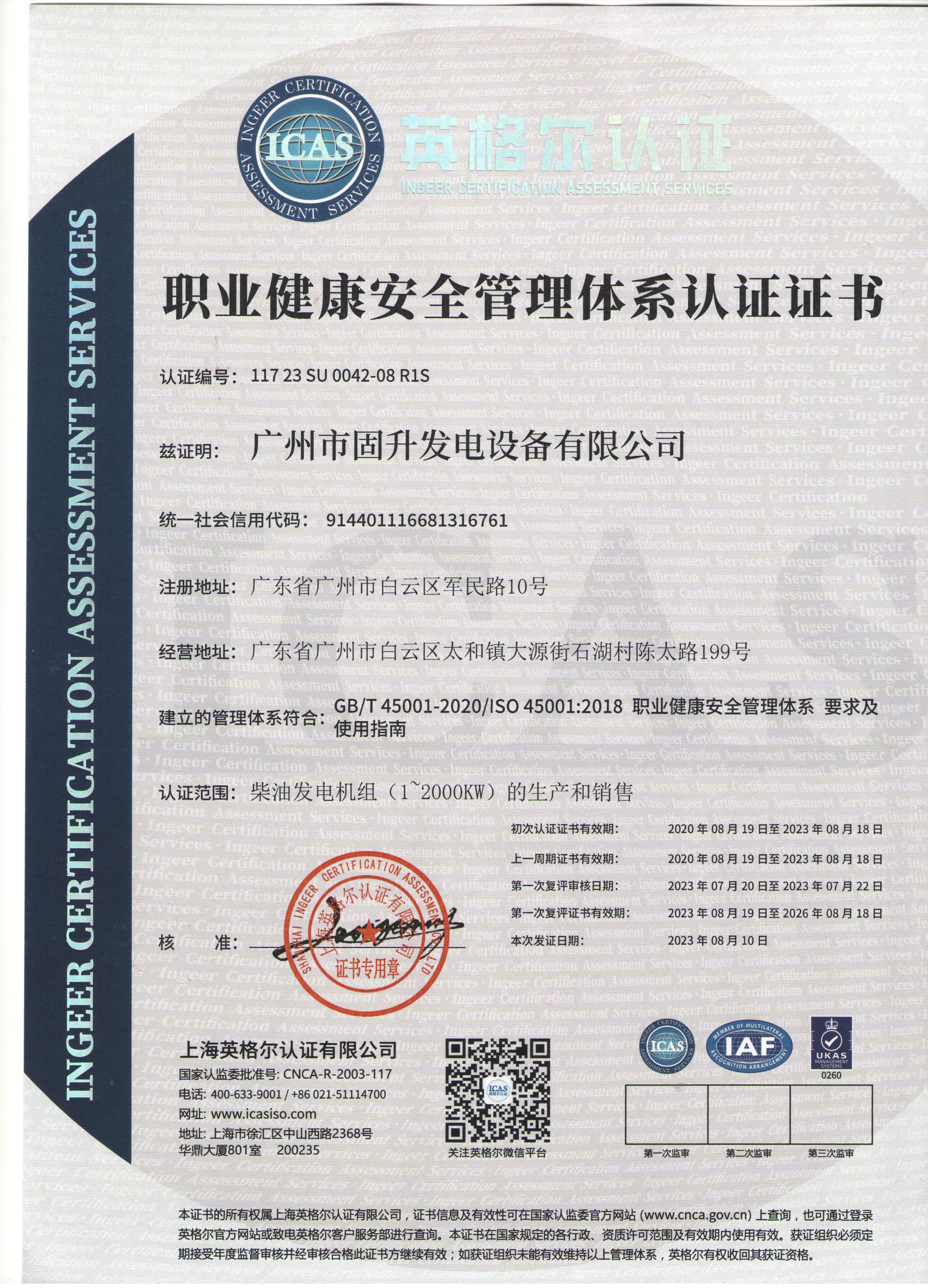 说明:兹证明有限公司的职业健康安全管理体系经考核注册符合GB/T4505001-2020/ISO45001:2018的要求。