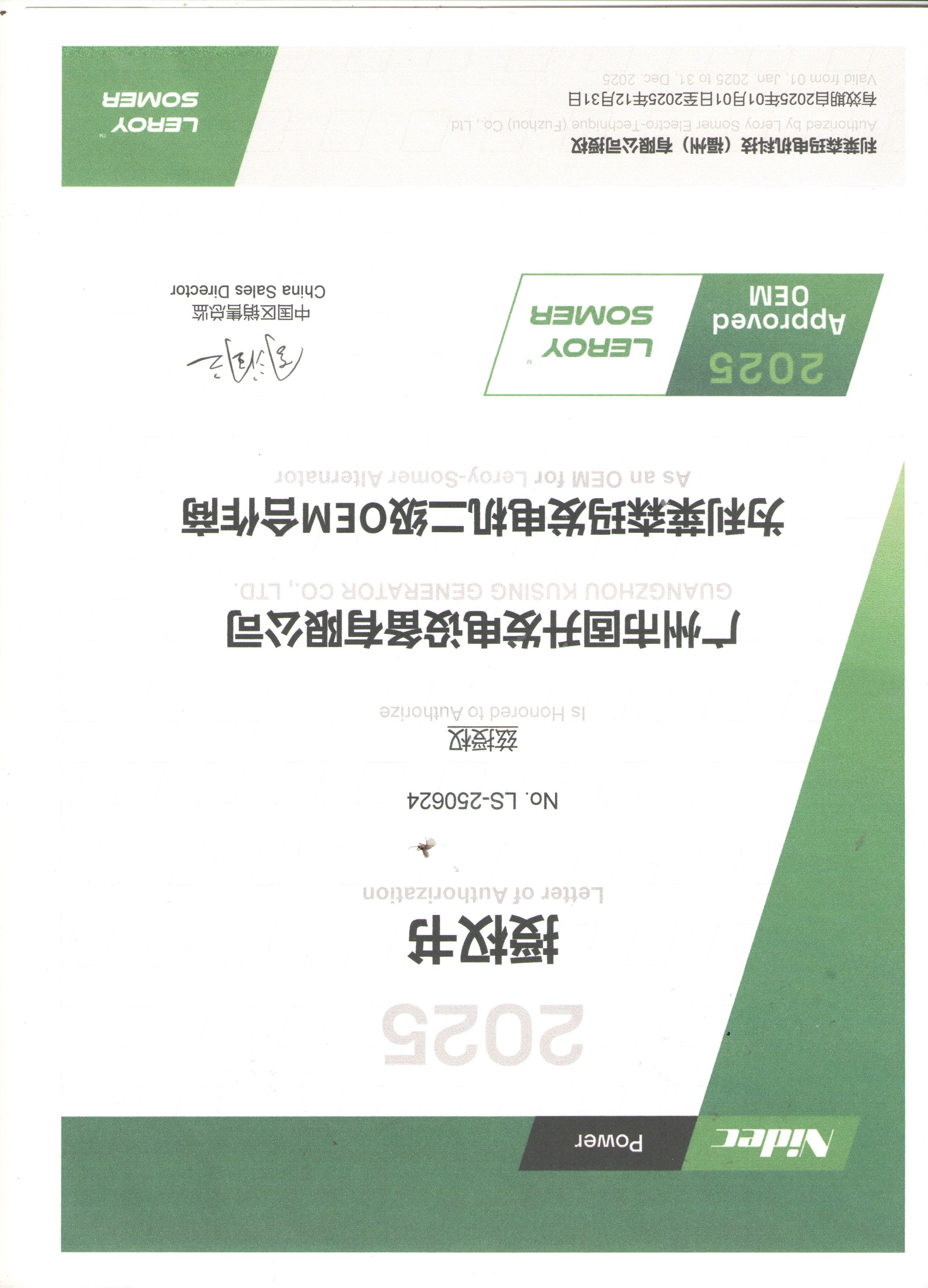 产品描述:兹授权贵司为利莱森玛发电机二级OEM合作商